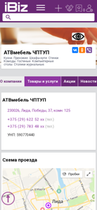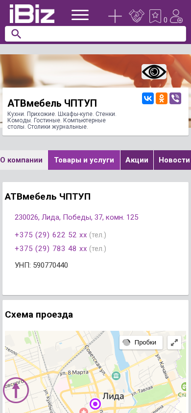 | AI-анализ | This website is for the furniture company ATVmebel CHTUP, located in Belarus, specifically in the city of Lida at the address Победы, 37, комн. 125. The company offers various types of furniture including kitchens, living rooms, wardrobes, walls, cabinets, dining rooms, computer desks, and journal tables. The website provides contact information with two phone numbers: +375 (29) 622 52 xx and +375 (29) 783 48 xx. The company's Unified State Register number is 590770440. The website also includes a map for visitors to easily find the location, business hours, and information about how to contact the company. The website is in the furniture category and is also listed under the furniture subcategory in |