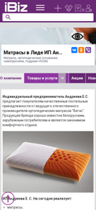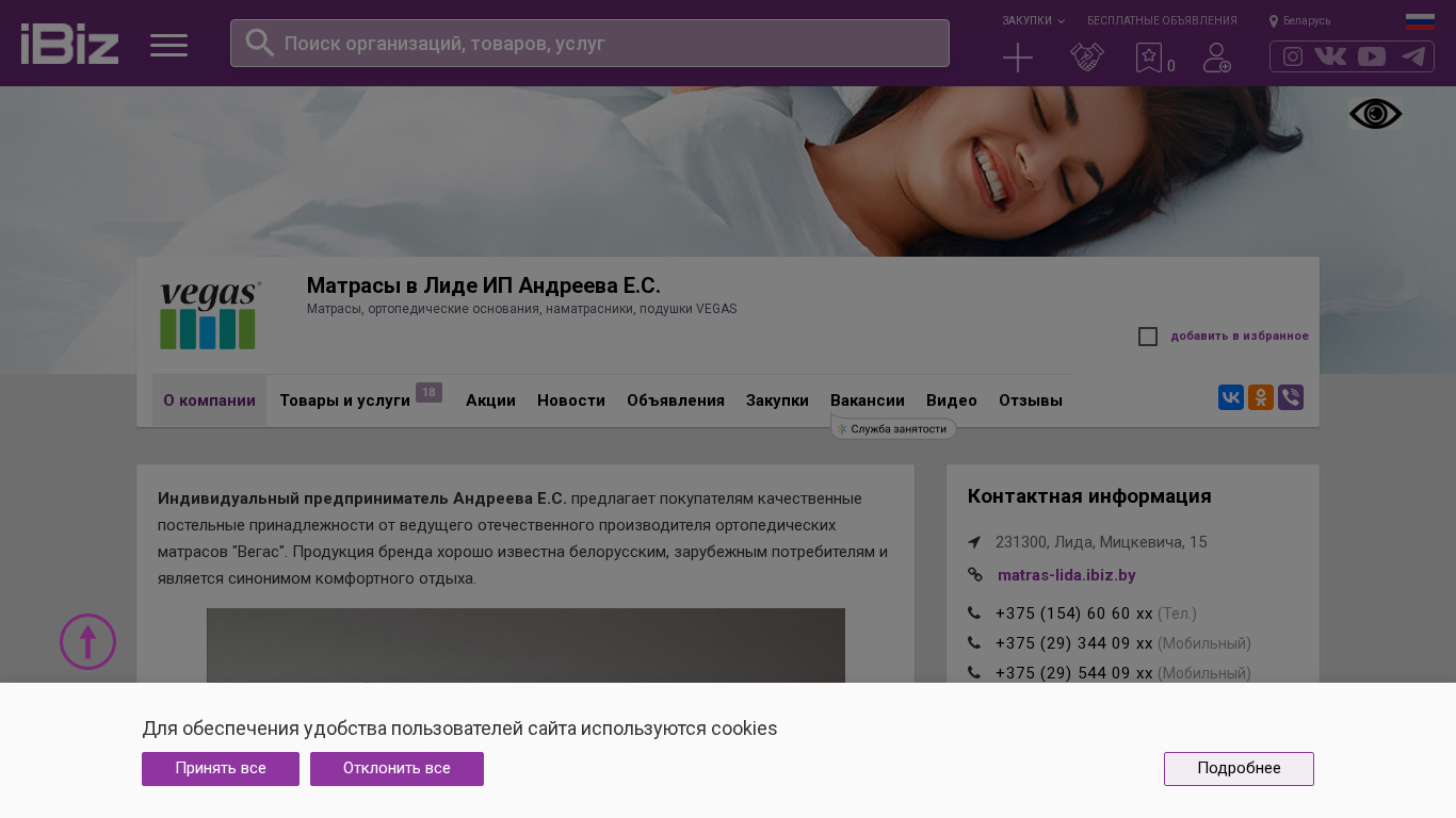 | AI-анализ | This website is an e-commerce platform for the Belarusian business "Матрасы в Лиде ИП Андреева Е.С.", selling mattresses, orthopedic foundations, mattress toppers, and Vegas poduškas. The website provides a map for navigation, contact numbers, and the address of the company located in Лида, Мицкевича, 15. The business specializes in selling high-quality mattresses from the domestic brand "Вегас", which is popular among Belarusian and foreign consumers and synonymous with comfortable relaxation. The website offers a wide range of products at affordable prices, with a focus on customer service to attract and retain buyers. The assortment is constantly updated with only high-quality products made of natural materials. Popular items include orthopedic mattresses, memory foam pillows, and ergonomic cushions. The website also |