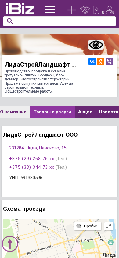 | Название / Заголовок | ЛидаСтройЛандшафт ООО - Производство, продажа и укладка тротуарной плитки. Бордюры, блок демлер. Благоустройство территорий. Продажа сыпучих материалов. Аренда строительной техники. Общестроительные работы.. 231284, Лида, , Невского, 15 |