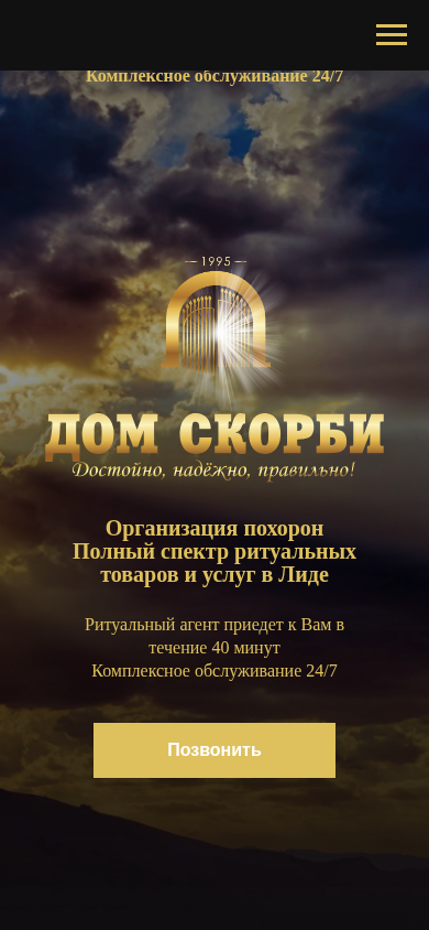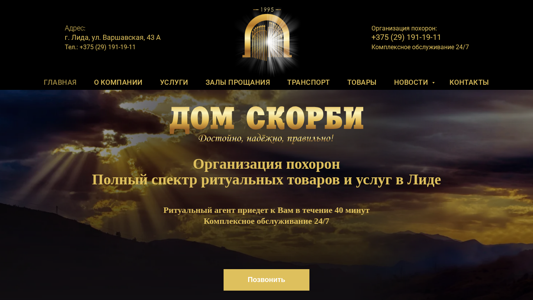 | AI-анализ | --- This online resource, titled "Дом Скорби" (House of Mourning), offers a comprehensive range of funeral services in the city of Лида, Belarus. The website provides information on the company, its offerings, and contacts. The main services include funeral halls, transportation, goods, and news. Users can find contact details for the organization of funeral services at +375 (29) 191-19-11, and for comprehensive services 24/7. The website highlights the organization's full spectrum of ritual goods and services, and assures a ritual agent will arrive within 40 minutes upon contact. The company provides various services such as document preparation, ritual transportation, and body storage in the morgue, among others. The website also mentions assistance in obtaining government benefits and offers a form for users to leave a request or call the number |