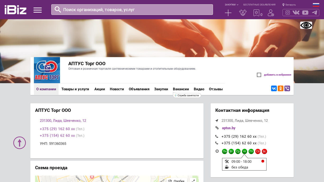 This website is for АПТУС Торг ООО, a company located in Лида, Belarus, at Шевченко 12. The company specializes in both wholesale and retail trade of sanitary products and heating equipment. Contact information, including two phone numbers, is provided. The company's UNP number is 591360365. The website features sections for the company's products and services, including heating equipment and sanitary products, as well as news, announcements, vacancies, and customer reviews. The company is listed under the categories of heating equipment and sanitary products in the city of Лида.