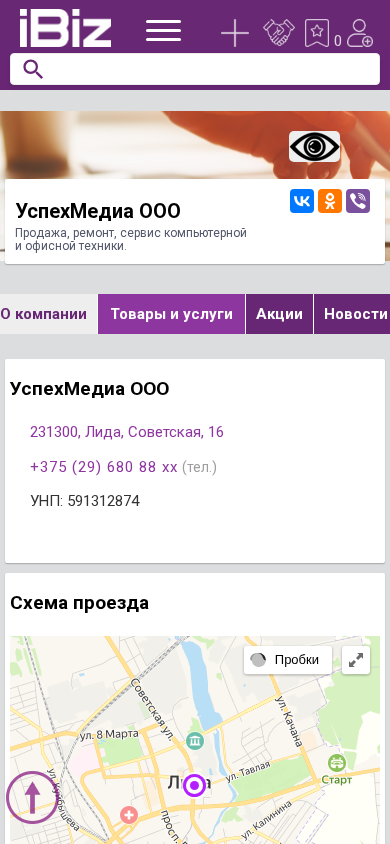 | AI-анализ | The website is a business entity named УспехМедиа ООО, located in Лида, Belarus, at the address Советская, 16. The company specializes in the sale, repair, and service of computer and office technology. Contact information includes the phone number +375 (29) 680 88 xx. The website provides a map and directions to the location, as well as business hours from Monday to Saturday, 09:00 to 18:00, with no breaks for lunch. The company is listed under the IT, internet and office technology category in the Ibiz.by business directory. |