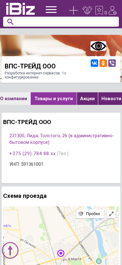 | AI-анализ | The web project 'ВПС-ТРЕЙД ООО' is a Belarusian business based in Лида, with a location at Толстого, 26 (в административно-бытовом корпусе). The company specializes in the development of internet services and 1c configuration. The site offers various company information, including contact details (375-29-784-88 xx) and a map for directions. The main sections of the site include 'О компании', 'Товары и услуги', 'Разработка, продажа программного обеспечения', and 'Акции, Новости, Объявления, Закупки, Вакансии, Видео, Отзывы'. The site also features a user agreement, public contract, and a rating of |