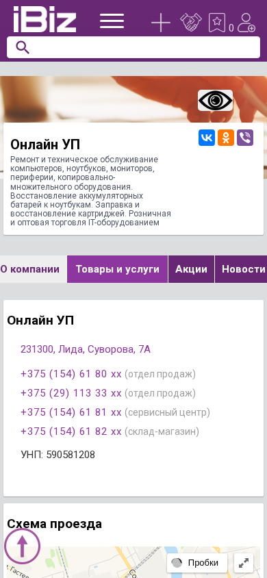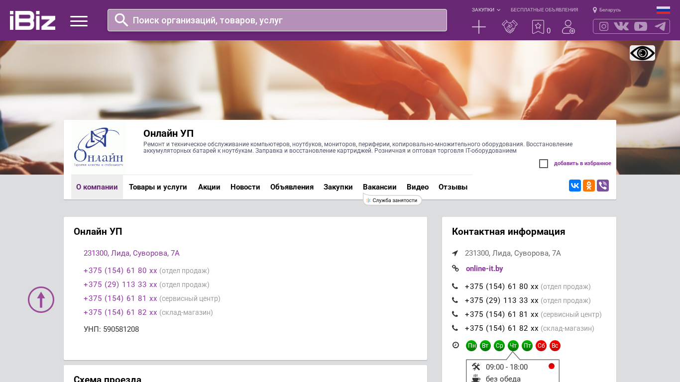 | Название / Заголовок | Онлайн УП - Ремонт и техническое обслуживание компьютеров, ноутбуков, мониторов, периферии, копировально-множительного оборудования. Восстановление аккумуляторных батарей к ноутбукам. Заправка и восстановление картриджей. Розничная и оптовая торговля IT-оборудованием. 231300, Лида, , Суворова, 7А |