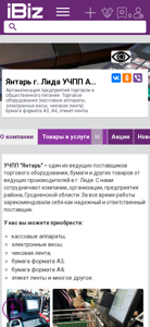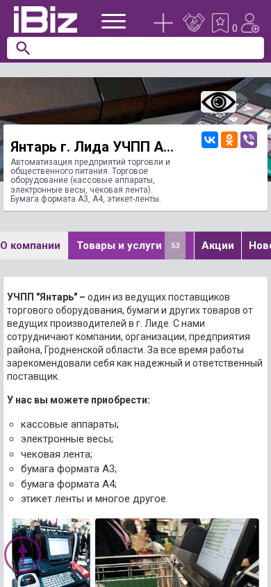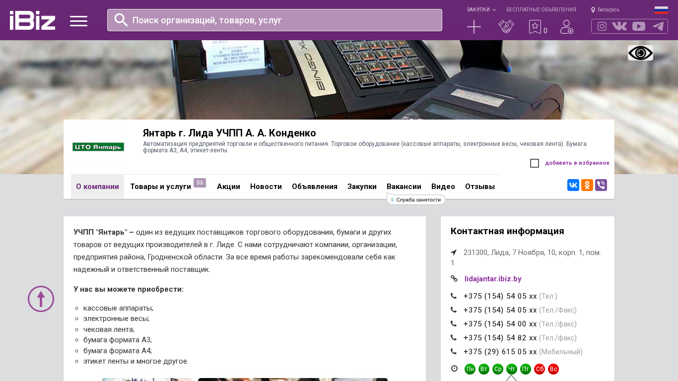 | Название / Заголовок | Янтарь г. Лида УЧПП А. А. Конденко - Автоматизация предприятий торговли и общественного питания. Торговое оборудование (кассовые аппараты, электронные весы, чековая лента). Бумага формата А3, А4, этикет-ленты.. 231300, Лида, , 7 Ноября, 10, корп. 1, пом. 1 |