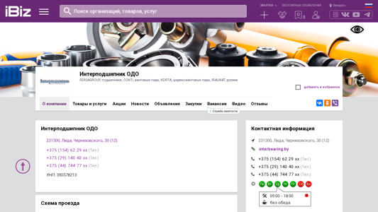 | AI-анализ | The web project "Interpodshipnik ODO - Fersagroup" is a Belarusian business specialized in selling and providing services related to various types of bearings, including CONTI, KORTA, IRAUNAT, vintoves and sharikovintoves parcels, and rollers. The company is located in the city of Lida, Chernyakhovskogo street, number 30 (12). The contact information for the company includes three phone numbers: +375 (154) 62 29 xx, +375 (29) 140 40 xx, and +375 (44) 744 77 xx. The business hours are from 9:00 to 18:00, Monday to Friday, with Saturdays and Sundays being days |