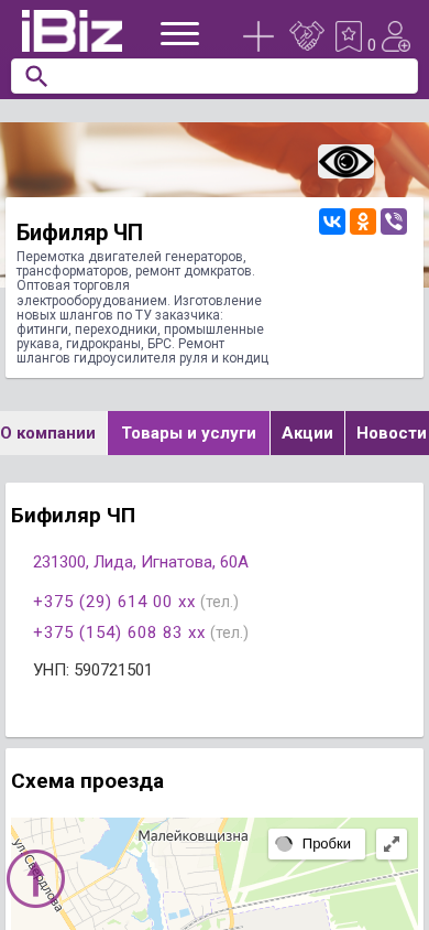 | AI-анализ | --- This website is for Belarusian company Biфиляр ЧП, located in Lida, Ignatova, 60A, offering services for the rewinding of engines in generators and transformers, as well as the repair of hydraulic cylinders. They also deal in the wholesale trade of electrical equipment and manufacture new pipes, fittings, connectors, industrial hoses, hydraulic cranes, and BRS according to the customer's technical requirements. The website provides a scheme for visiting the company, contact telephone numbers, and an address. The company's UNP number is 590721501. The opening hours are from 9:00 to 18:00, Monday through Friday, with Saturdays and Sundays being holidays. Services include the repair of hydraulic pump shafts |