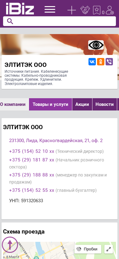 | Название / Заголовок | ЭЛТИТЭК ООО - Источники питания. Кабеленесущие системы. Кабельно-проводниковая продукция. Крепеж. Удлинители. Электроламповые изделия. . 231300, Лида, , Красногвардейская, 21, оф. 2 |