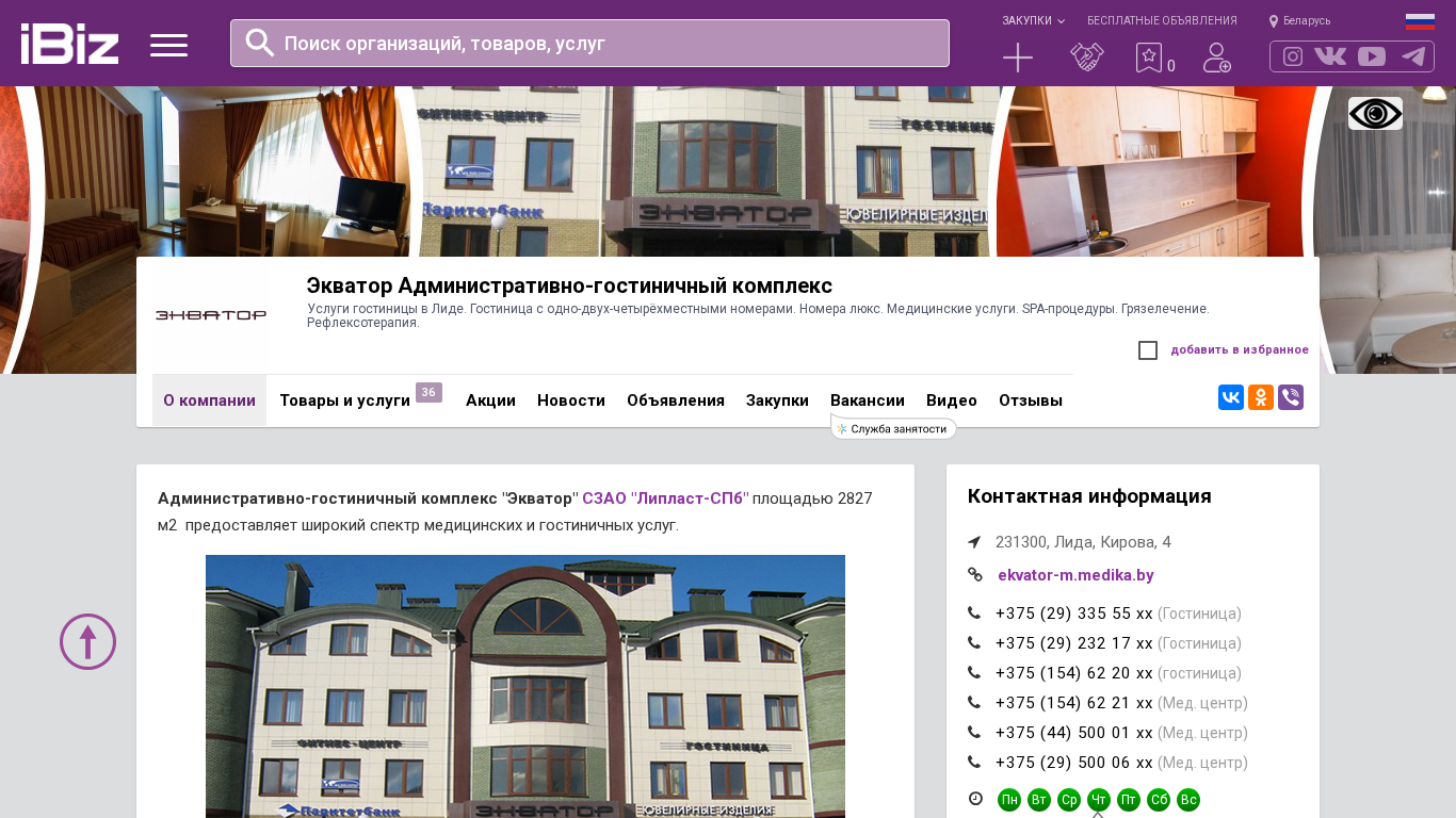 | Название / Заголовок | Экватор Административно-гостиничный комплекс - Услуги гостиницы в Лиде. Гостиница с одно-двух-четырёхместными номерами. Номера люкс. Медицинские услуги. SPA-процедуры. Грязелечение. Рефлексотерапия.. 231300, Лида, , Кирова, 4 |