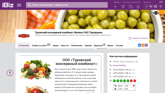 | AI-анализ | The portal turov-combinat.ibiz.by is a Belarusian website dedicated to the Turovsky Conservatory Combine, a branch of OAO Turovschina. The website offers information on the production and sale of canned green peas, sugar corn, juices, pudding, jams, marinades, and tomato paste. The site includes a map and contact information for the Turovsky Conservatory Combine located at 247980, Turov, Leninskaya Street, 152. The site also features free classified ads for buying and selling, as well as news, announcements, vacancies, and company information. The Turovsky Conservatory Combine was founded in 1951 as part of the Turov District Food Combine. Initially occupying a 3-hectare area, the factory faced |