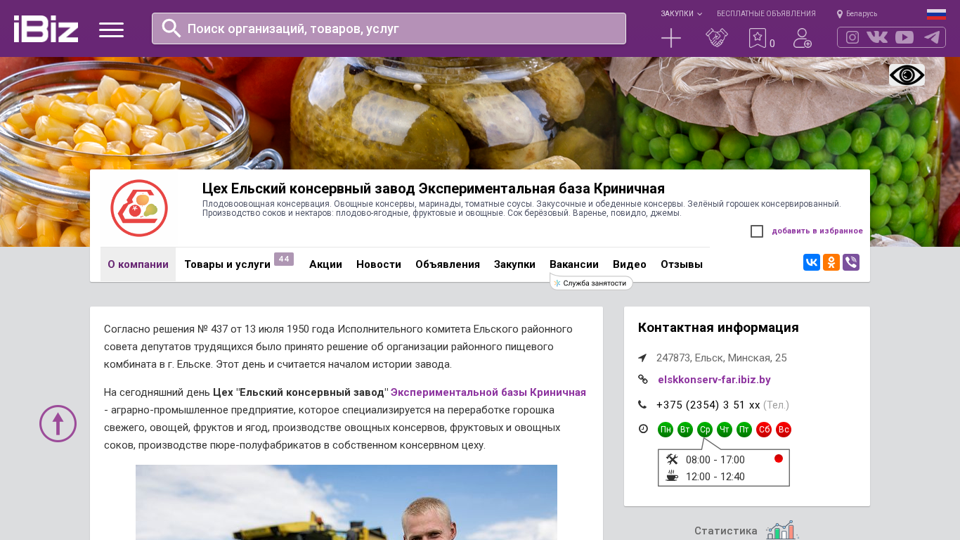 Название / ЗаголовокЦех Ельский консервный завод Экспериментальная база Криничная - Плодовоовощная консервация. Овощные консервы, маринады, томатные соусы. Закусочные и обеденные консервы. Зелёный горошек консервированный. Производство соков и нектаров: плодово-ягодные, фруктовые и овощные. Сок берёзовый. Варенье, повидло, джемы.. 247873, Ельск, , Минская, 25