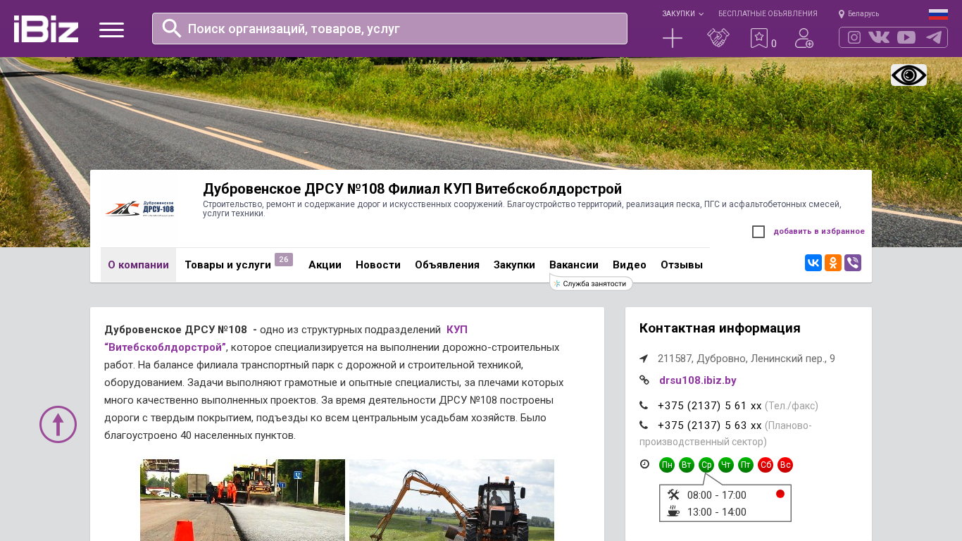 | AI-анализ | The website is that of Dubrovensko DRSU No. 108, a branch of KUP Vitsebskoblgorstroy, specializing in road construction, repair and maintenance, as well as the construction of artificial structures and site improvement. The company offers sand, gravel and asphalt concrete mixtures for sale, as well as technical services. The site includes a map, contact information and the address of the company: Dubrovno, Leninsky per., 9, 211587. The website also features a section for free classified ads. The company's portfolio includes the construction of paved roads, the improvement of 40 settlements, and the execution of various types of road and construction projects. The company offers services in the following areas: road construction, reconstruction and maintenance; site improvement; production and sale of asphalt concrete mixtures; sand and gravel |