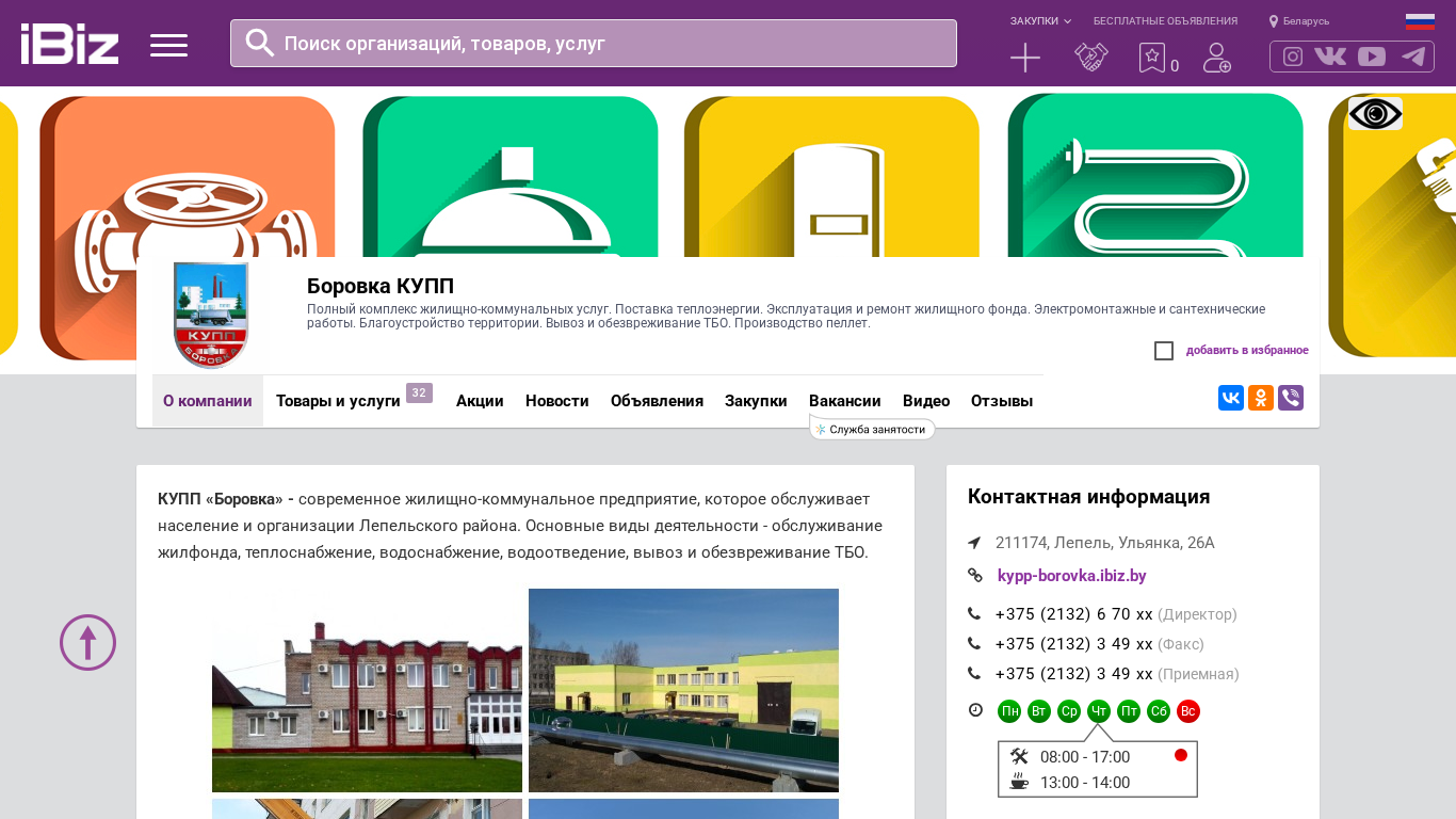 | Название / Заголовок | Боровка КУПП - Полный комплекс жилищно-коммунальных услуг. Поставка теплоэнергии. Эксплуатация и ремонт жилищного фонда. Электромонтажные и сантехнические работы. Благоустройство территории. Вывоз и обезвреживание ТБО. Производство пеллет.. 211174, Лепель, , Ульянка, 26А |