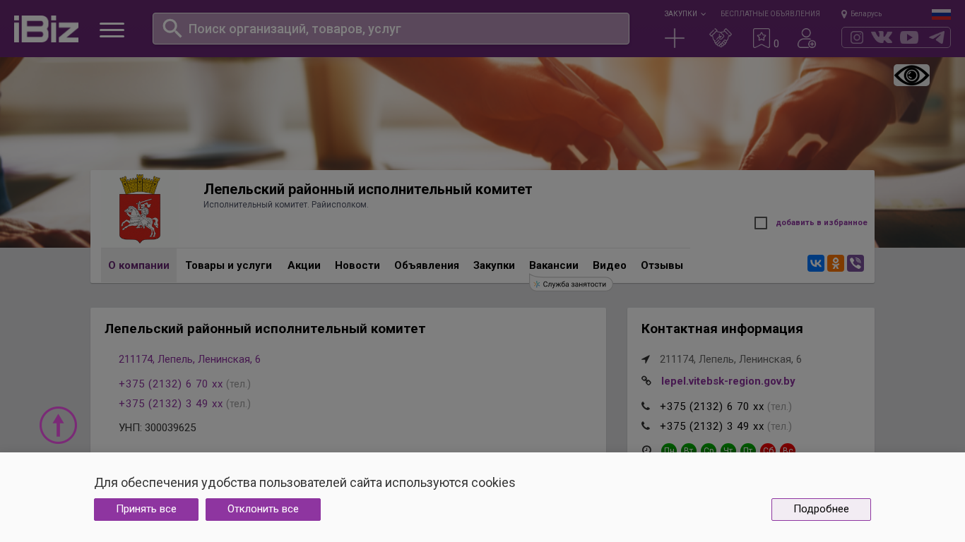 | Название / Заголовок | Лепельский районный исполнительный комитет - Исполнительный комитет. Райисполком.. 211174, Лепель, , Ленинская, 6 |