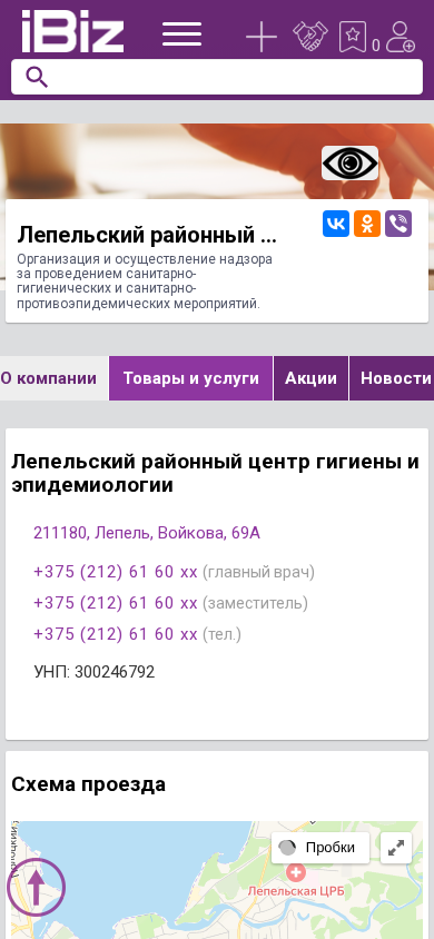 | Название / Заголовок | Лепельский районный центр гигиены и эпидемиологии - Организация и осуществление надзора за проведением санитарно-гигиенических и санитарно-противоэпидемических мероприятий.. 211180, Лепель, , Войкова, 69А |