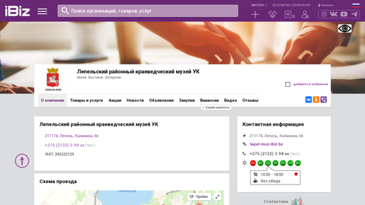 | AI-анализ | The web project "Лепельский районный краеведческий музей УК - Музеи. Выставки. Экскурсии.." is a local history museum located in the city of Лепель, Belarus, with the postal address Калинина, 66. The museum offers various exhibitions, tours, and schemes for visiting. Contact information includes a phone number +375 (2132) 3 94 xx, and the Unified State Register number 390333129. The museum operates Monday through Sunday from 10:00 to 18:00, without lunch hours. Visitors can find the organization in the "Музеи" category of the Business Catalogue of Belarus. |