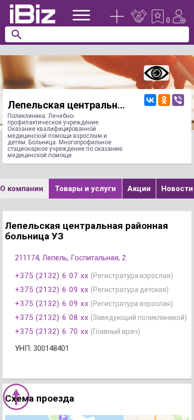 | Название / Заголовок | Лепельская центральная районная больница УЗ - Поликлиника. Лечебно-профилактическое учреждение. Оказание квалифицированной медицинской помощи взрослым и детям. Больница. Многопрофильное стационарное учреждение по оказанию медицинской помощи.. 211174, Лепель, , Госпитальная, 2 |