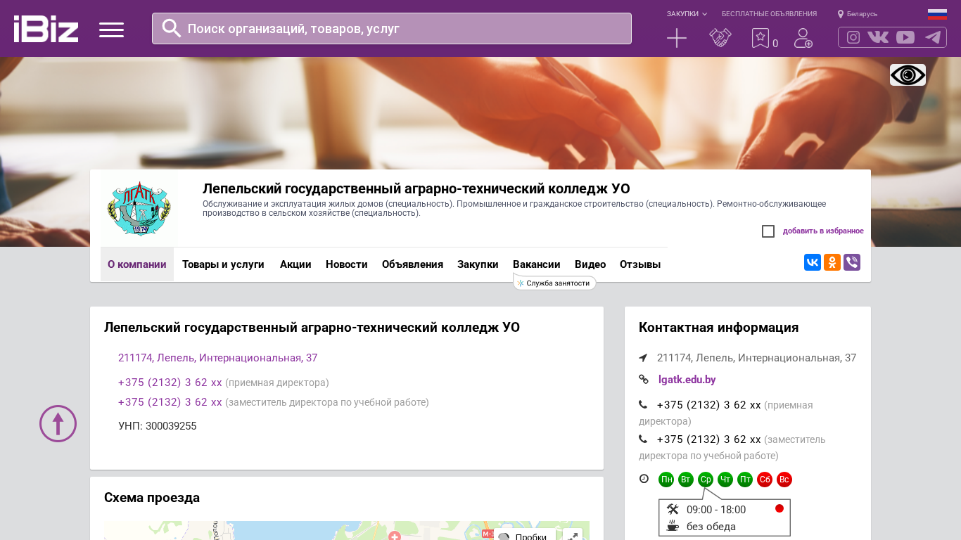 | AI-анализ | This online resource is the official website of the State Agricultural and Technical College in the city of Lepeль, Belarus. The college offers several specializations: Servicing and exploitation of residential buildings, Industrial and civil construction, and Repair and maintenance services in agriculture. The site provides a map for visitors, contact numbers, and the address of the college: 211174, Lepeel, Internationalnaya Street, 37. The site offers various services and goods, including educational programs, job vacancies, and announcements for purchases. Users can create their own maps, check traffic conditions, and access the company's contact information. The college operates Monday through Friday from 9:00 AM to 6:00 PM, with no lunch break. The site is part of the IBiz Media LLC catalog of businesses and organizations in Belarus. |