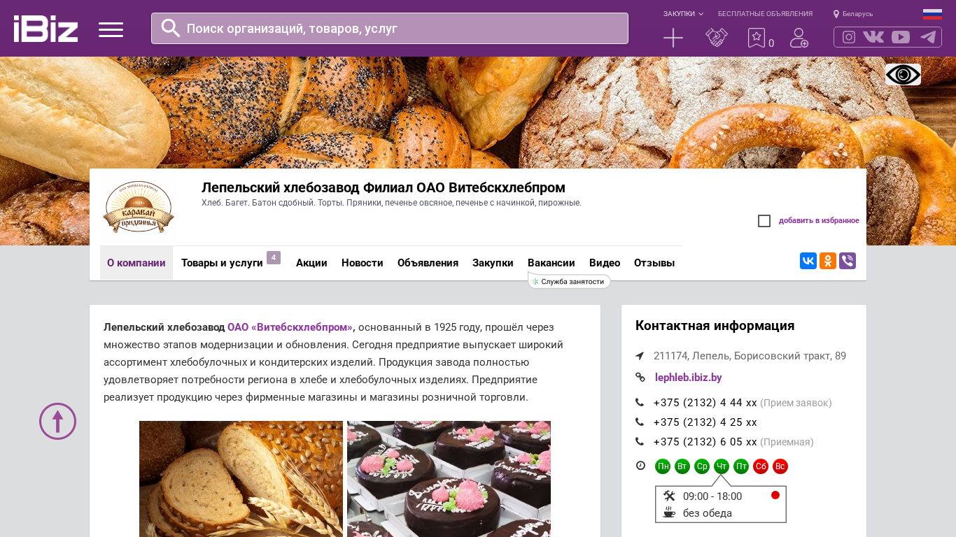 | AI-анализ | This website is for the Lepeльsky Hlebopzdav Filial of OAO Vitsebskhlebprom, located in Lepeль, Belarus at Borisovskiy Trakt 89. The company specializes in the production and sale of various bread and bakery items, including scones, cakes, pastries, and pies. The website provides a map and contact information, including phone numbers for accepting orders and receiving inquiries. The company operates Monday to Friday from 9:00 AM to 6:00 PM without a lunch break. The Lepeльsky Hlebopzdav Filial of OAO Vitsebskhlebprom was founded in 1925 and has undergone numerous modernizations and improvements over the years. Today, the company produces a wide range of bakery and confection |