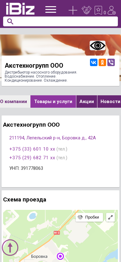 | AI-анализ | This online resource, akstg.ibiz.by, is a company website for AkstehnoGroupp OOO, a distributor of pumping equipment. The website offers solutions for water supply, heating, air conditioning, and cooling. The company is located in 211194, Lepeльsky r-n, Borovka d., 42A. The contact numbers for AkstehnoGroupp OOO are +375 (33) 601 10 xx and +375 (29) 682 71 xx. The business hours are from 9:00 to 18:00, Monday through Friday, with weekends being holidays. The website also features a map for directions and a public contract agreement. The company specializes in the sale and distribution of pumps and pumping equipment. |