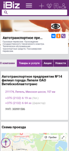 | Название / Заголовок | Автотранспортное предприятие №14 филиал города Лепеля ОАО Витебскоблавтотранс - Грузовые перевозки. Прохождение государственного технического осмотра. Техническое обслуживание транспортных средств. Пассажирские перевозки.. 211174, Лепель, , Минское шоссе, 157 км |