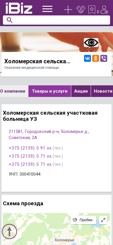 | AI-анализ | The website is a medical facility, specifically a rural outpatient clinic named Холомерская сельская участковая больница УЗ, located at Советская 2A, Холомерье д., 211581, Городокский р-н in Belarus. The title of the website is "Холомерская сельская участковая больница УЗ - Оказание медицинской помощи.." and it provides contact information including three phone numbers and the Belarusian Unified State Register number 300410044. The website offers various medical services and operates from Monday to Friday, 08:00 to 17:00 without lunch breaks. The website also includes a map and instructions on how to get there, as well as a contact form and links to other categories such as "Bolnicies, |