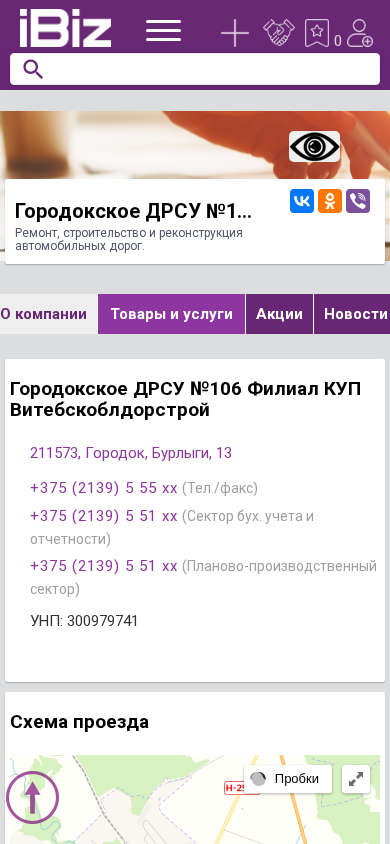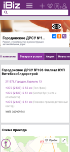 | Название / Заголовок | Городокское ДРСУ №106 Филиал КУП Витебскоблдорстрой - Ремонт, строительство и реконструкция автомобильных дорог.. 211573, Городок, , Бурлыги, 13 |