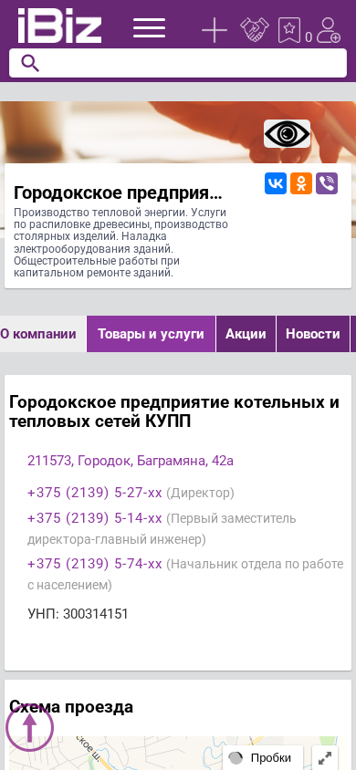 | Название / Заголовок | Городокское предприятие котельных и тепловых сетей КУПП - Производство тепловой энергии. Услуги по распиловке древесины, производство столярных изделий. Наладка электрооборудования зданий. Общестроительные работы при капитальном ремонте зданий.. 211573, Городок, , Баграмяна, 42а |
