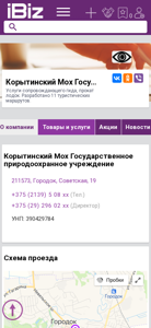 | Название / Заголовок | Корытинский Мох Государственное природоохранное учреждение - Услуги сопровождающего гида, прокат лодок. Разработано 11 туристических маршрутов.. 211573, Городок, , Советская, 19 |
