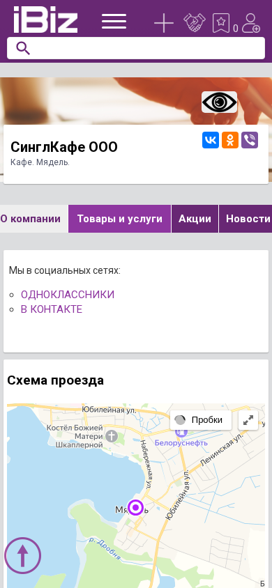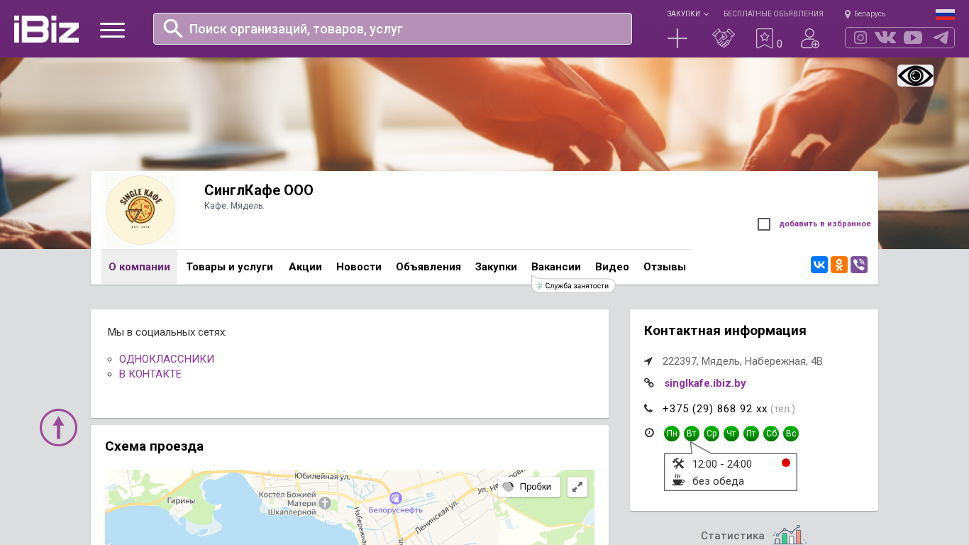 | AI-анализ | This website is for SinglCafe OOO, a cafe located in Mialel, Belarus at the address Набережная, 4В. The website provides information on how to reach the cafe, contact details, and company information. SinglCafe offers various services including cafes, bars, and restaurants. Users can view company news, job openings, and video content. The website also features customer reviews on VKontakte and Odnoklassniki, as well as a contact form. SinglCafe operates seven days a week without serving lunch. The company can be found in the categories of cafes, bars, and restaurants, as well as in Mialel. Users can add the organization to their favorites and access user agreements and public contracts. The website is operated by OOO "Aibiz Media" - a catalog of businesses and organizations in Belar |