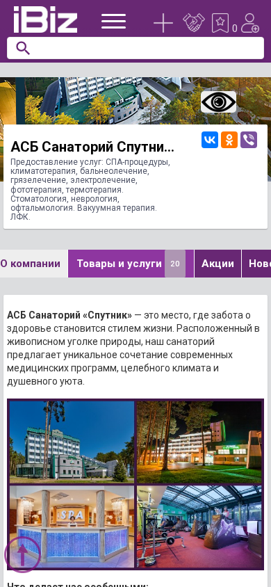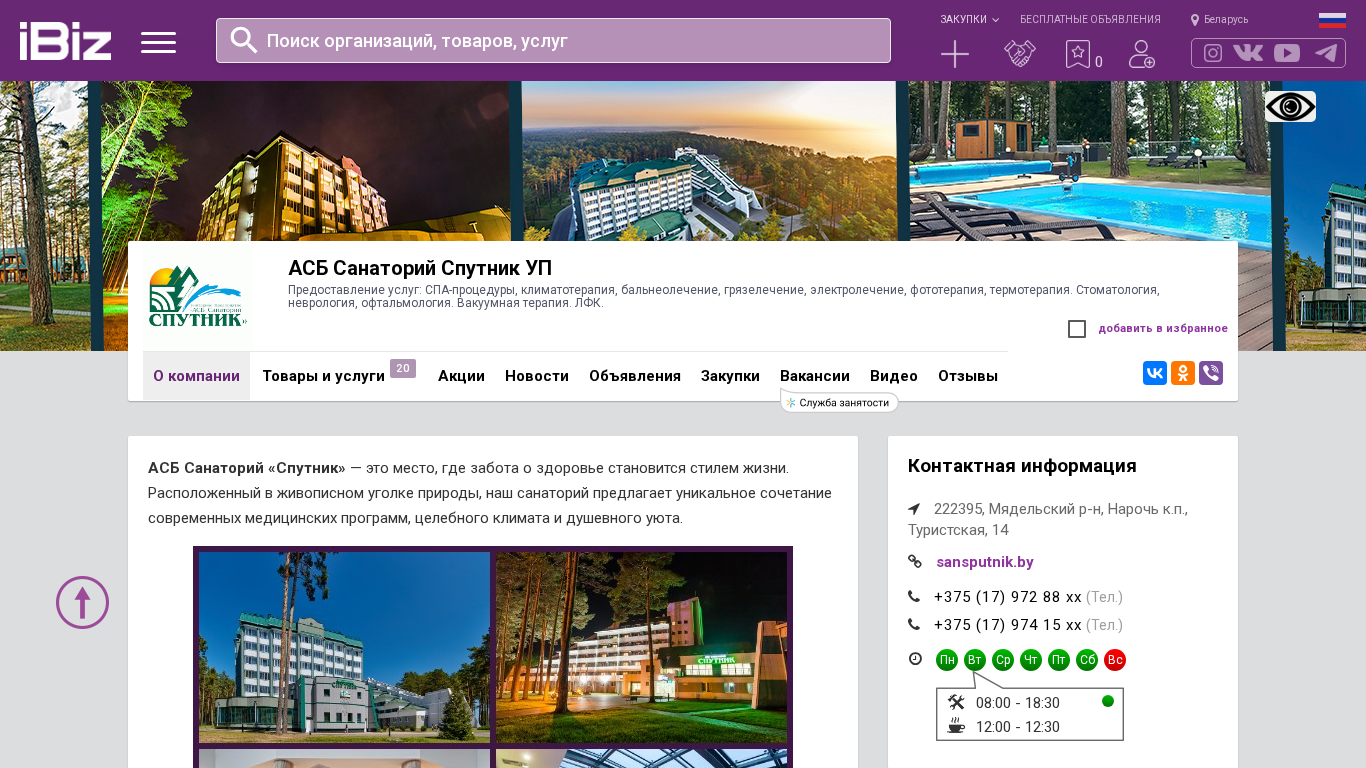 | Название / Заголовок | АСБ Санаторий Спутник УП - Предоставление услуг: СПА-процедуры, климатотерапия, бальнеолечение, грязелечение, электролечение, фототерапия, термотерапия. Стоматология, неврология, офтальмология. Вакуумная терапия. ЛФК.. 222395, , Нарочь к.п., Туристская, 14 |