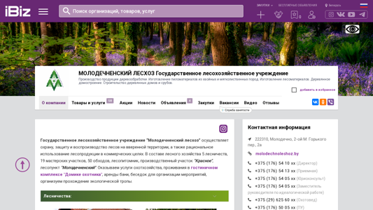 | AI-анализ | This website is for a state-owned forestry enterprise named "МОЛОДЕЧНЕНСКИЙ ЛЕСХОЗ" (Molodechny Leshoz) located in Molodeчно, Belarus. The enterprise specializes in the production of wood and timber products, including pine and softwood boards, wood materials, and wooden houses and structures. The company also offers services related to forestry, such as hunting and accommodation in a guest complex. The contact information and addresses of five forestry departments and a production site are provided on the website. |