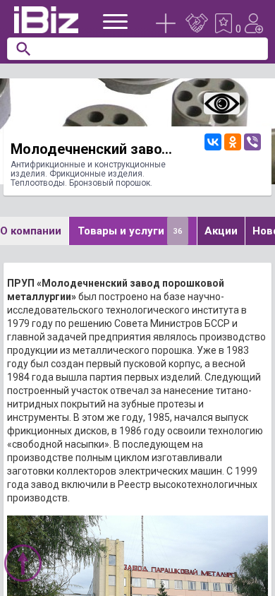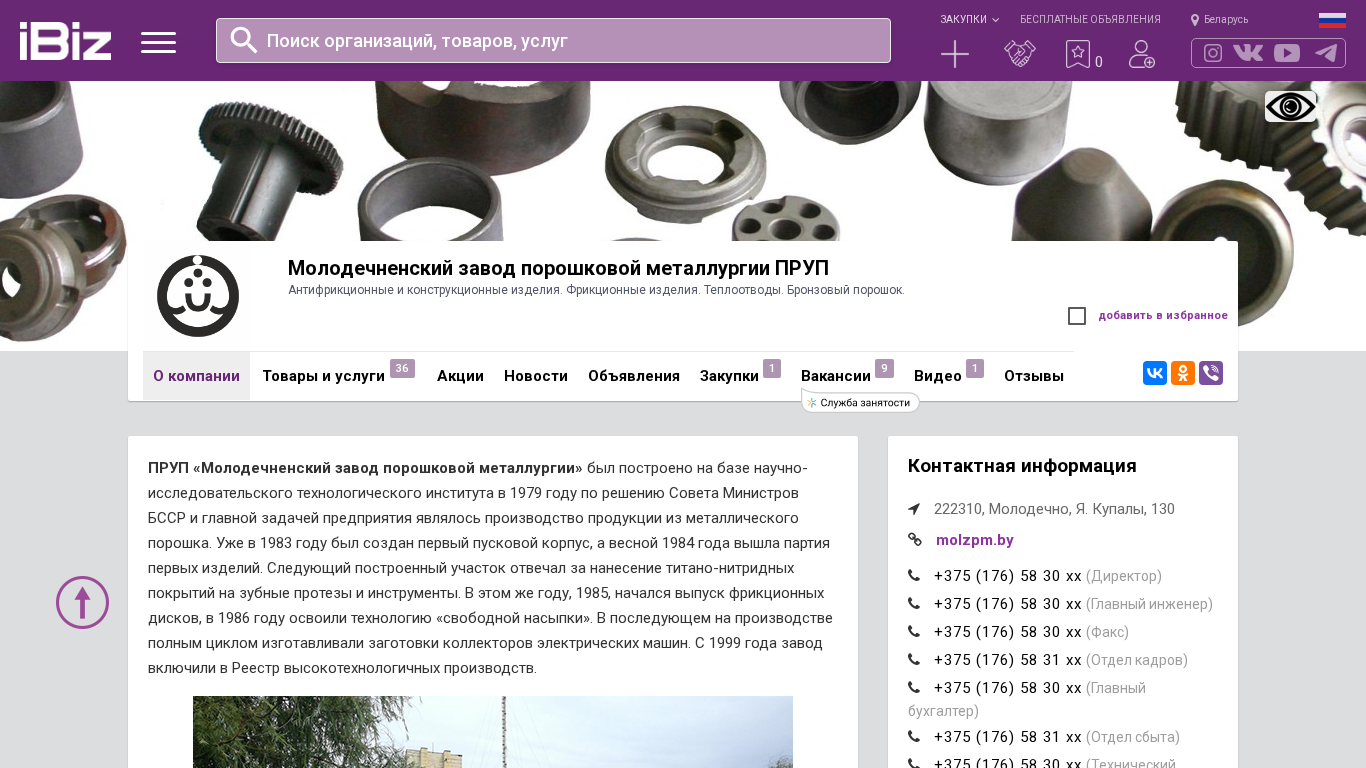 | Название / Заголовок | Молодечненский завод порошковой металлургии ПРУП - Антифрикционные и конструкционные изделия. Фрикционные изделия. Теплоотводы. Бронзовый порошок. . 222310, Молодечно, , Я. Купалы, 130 |