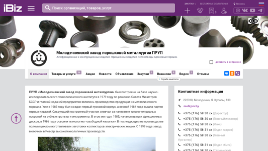 | AI-анализ | The website is a business domain for the Mолодечненский завод порошковой металлургии ПРУП, located in Молодечно, Belarus, at Я. Купалы, 130. The company specializes in the production of antifrictional and constructive components, frictional items, heat exchangers, and bronze powder. The website provides no further information or contacts. |