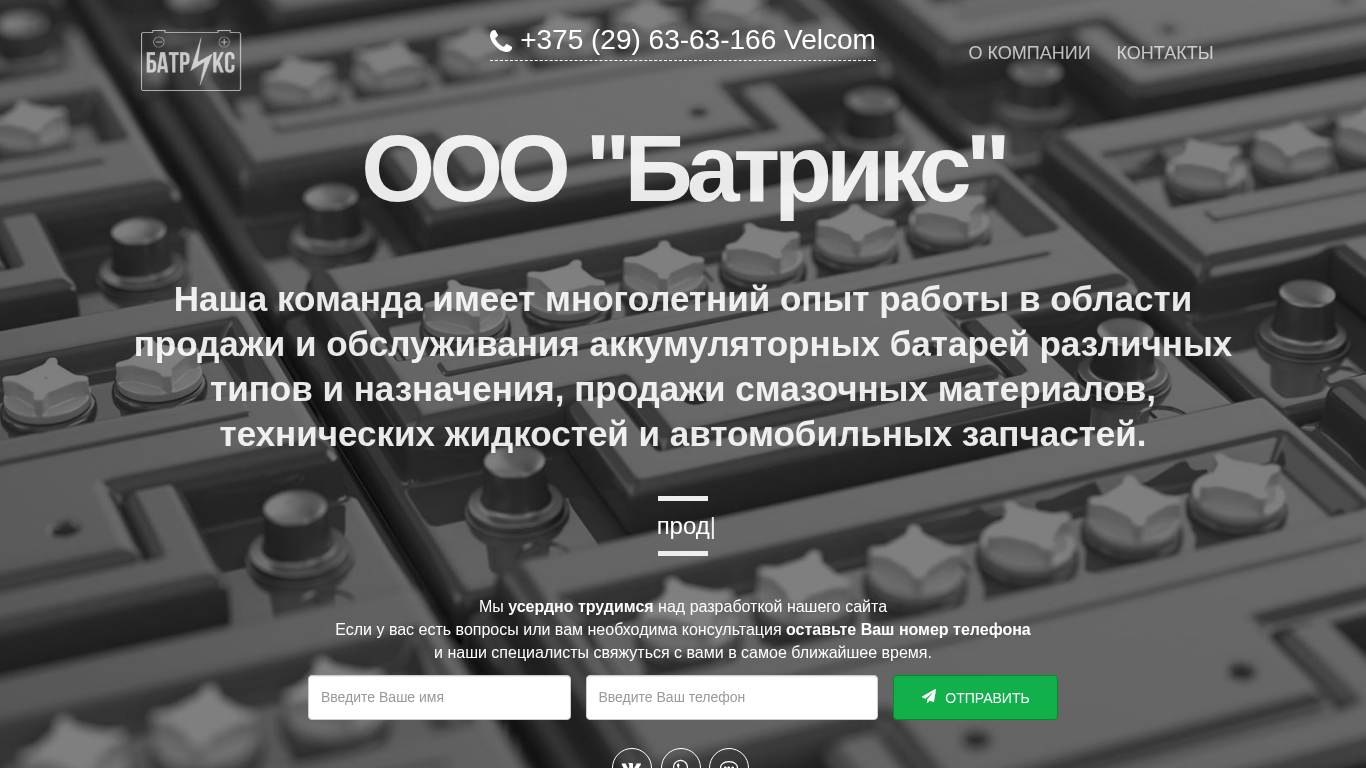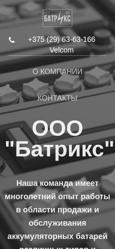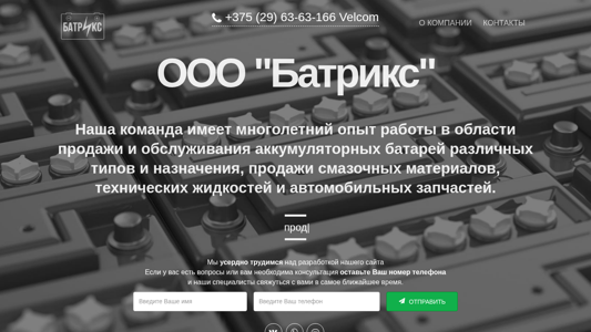 The portal "Батрикс" is a Belarusian e-commerce website specializing in the sale and servicing of various types and applications of automobile and other equipment batteries, as well as selling lubricants, technical liquids, and auto parts. The company has a long-standing experience in this field and offers guarantee and post-sale services, battery testing, and purchasing used batteries from the population for further processing. The contact information includes several phone numbers and an email address, with business hours indicated as Monday to Saturday from 9:00 to 18:00, and Sunday from 9:00 to 16:00, located in the city of Molodecnco, at ul. Gorodokskaya st. 104, office 100.