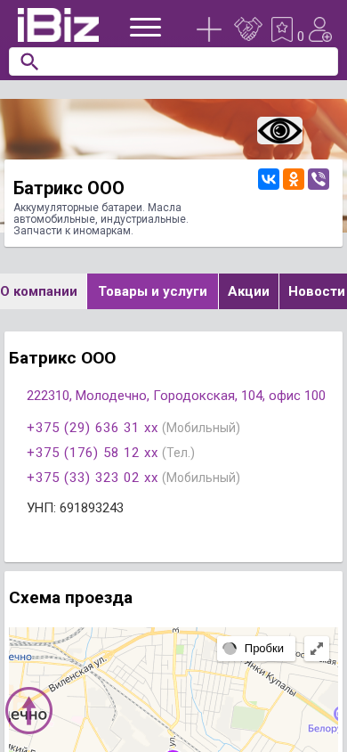 | Название / Заголовок | Батрикс ООО - Аккумуляторные батареи. Масла автомобильные, индустриальные. Запчасти к иномаркам.. 222310, Молодечно, , Городокская, 104, офис 100 |