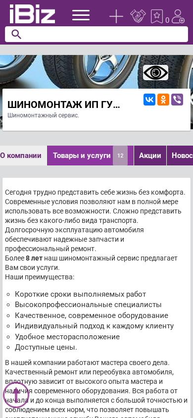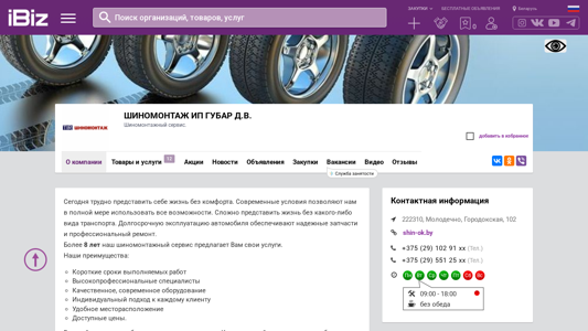 | AI-анализ | This online resource is a tire service company named ШИНОМОНТАЖ ИП ГУБАР Д.В. located in Mолодечно, Belarus. The company offers tire repair and replacement services, as well as other auto services. The website includes a map with directions to the location at Городокская, 102, and contact information. The company has been in business for over 8 years and prides itself on quick turnaround times, highly skilled technicians, modern equipment, personalized customer service, and affordable pricing. The website features a menu with sections for the company, products and services, news, job listings, and customer reviews on social media platforms. The company offers a full range of tire services for various types of vehicles, including computerized balancing, repair of complex damages, and replacement of vent valves in camber chambers for both light vehicles |