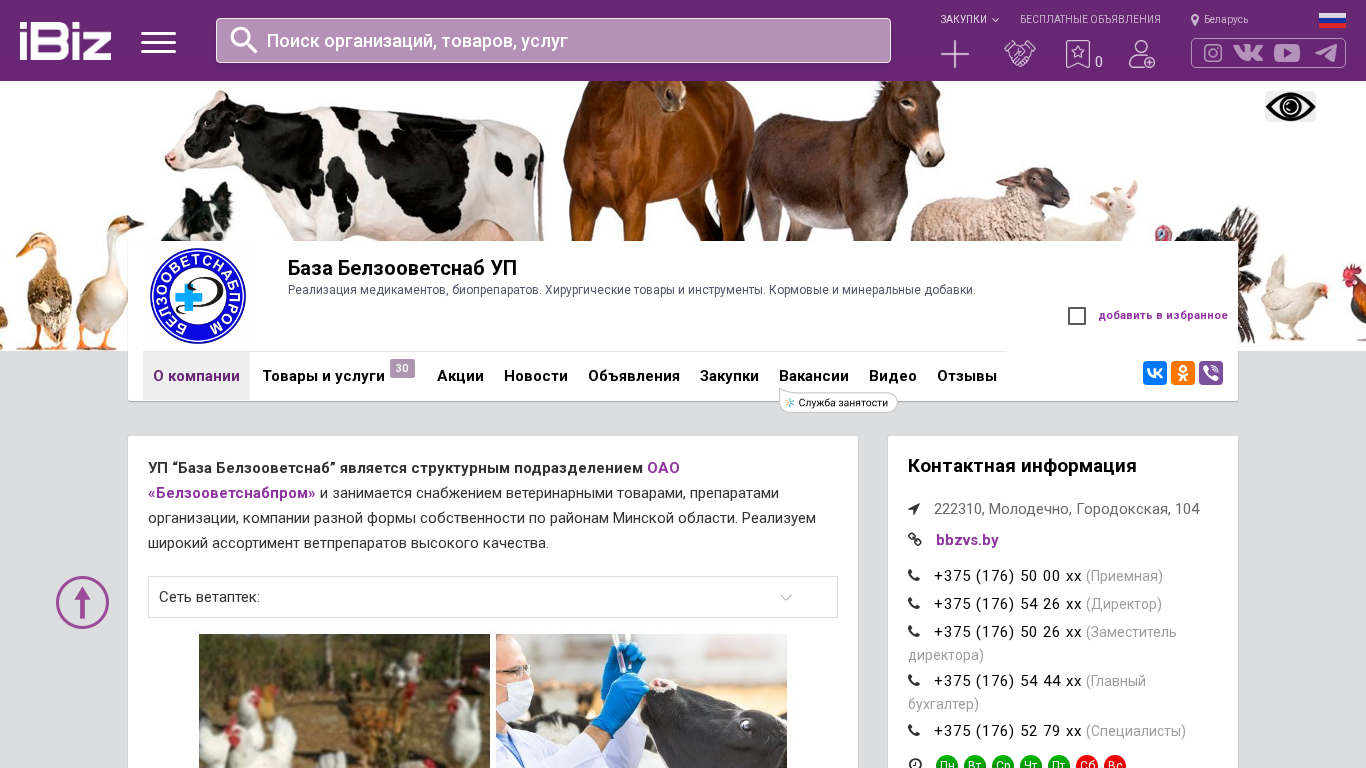 | Название / Заголовок | База Белзооветснаб УП - Реализация медикаментов, биопрепаратов. Хирургические товары и инструменты. Кормовые и минеральные добавки.. 222310, Молодечно, , Городокская, 104 |