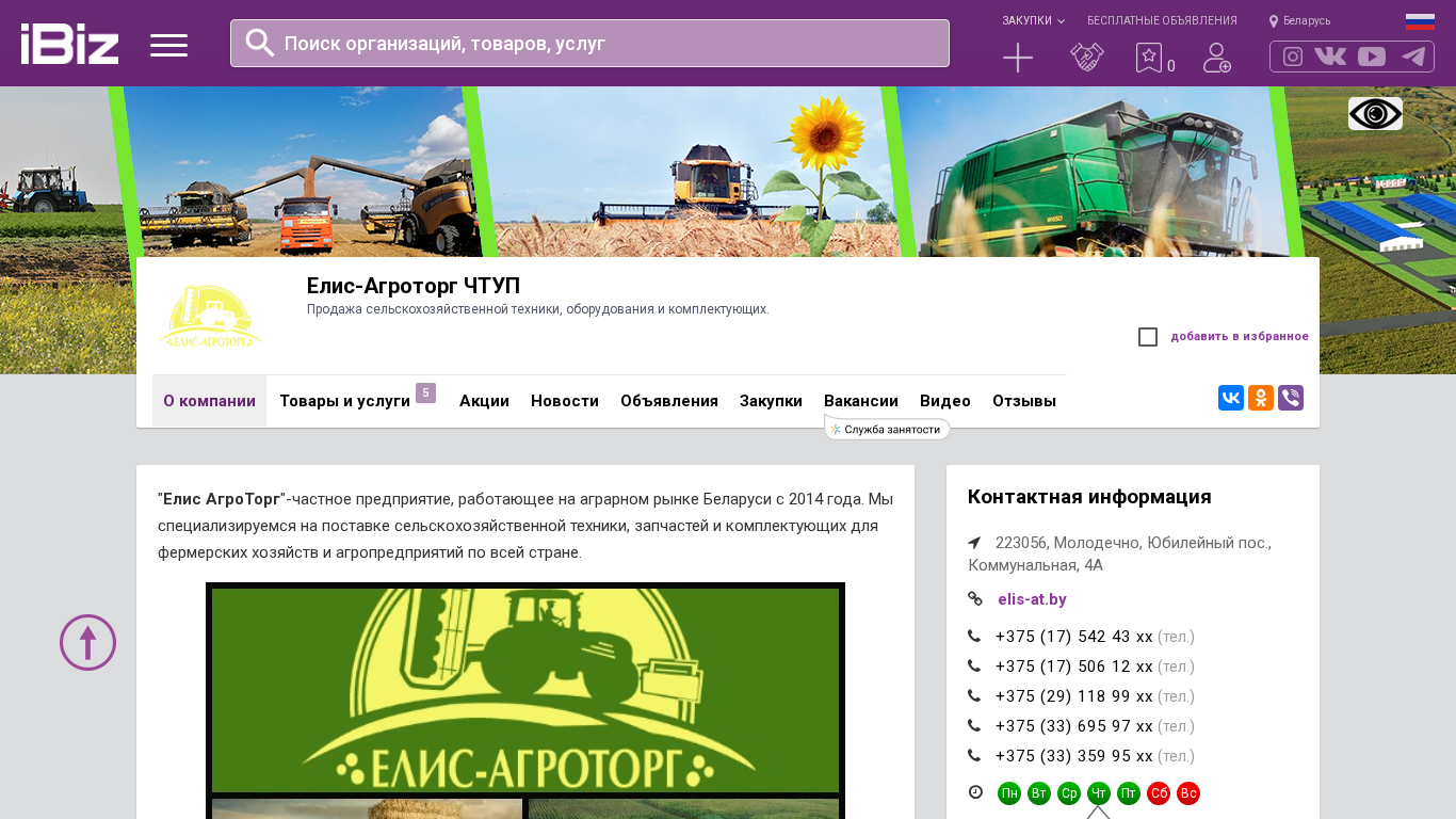 | AI-анализ | This online resource is dedicated to Elis-Agrotorg CHTUP, a company based in Molodeчно, Belarus, specializing in the sale of agricultural machinery, equipment, and spare parts. The website offers various services including technical consultations, client support, and the option to add items to a favorites list. Elis-Agrotorg was established in 2014 and focuses on providing agricultural equipment, parts, and consulting services to farmers and agricultural businesses throughout the country. The main business areas are the sale of agricultural machinery and equipment, wholesale and retail trade of spare parts, and technical support and client guidance through the purchasing and operational phases. The company is chosen for its reliability, professionalism, and attentiveness to clients. Elis-Agrotorg offers more than just a selection of machinery and parts; they help clients find optimal solutions based on their specific needs and budgets |