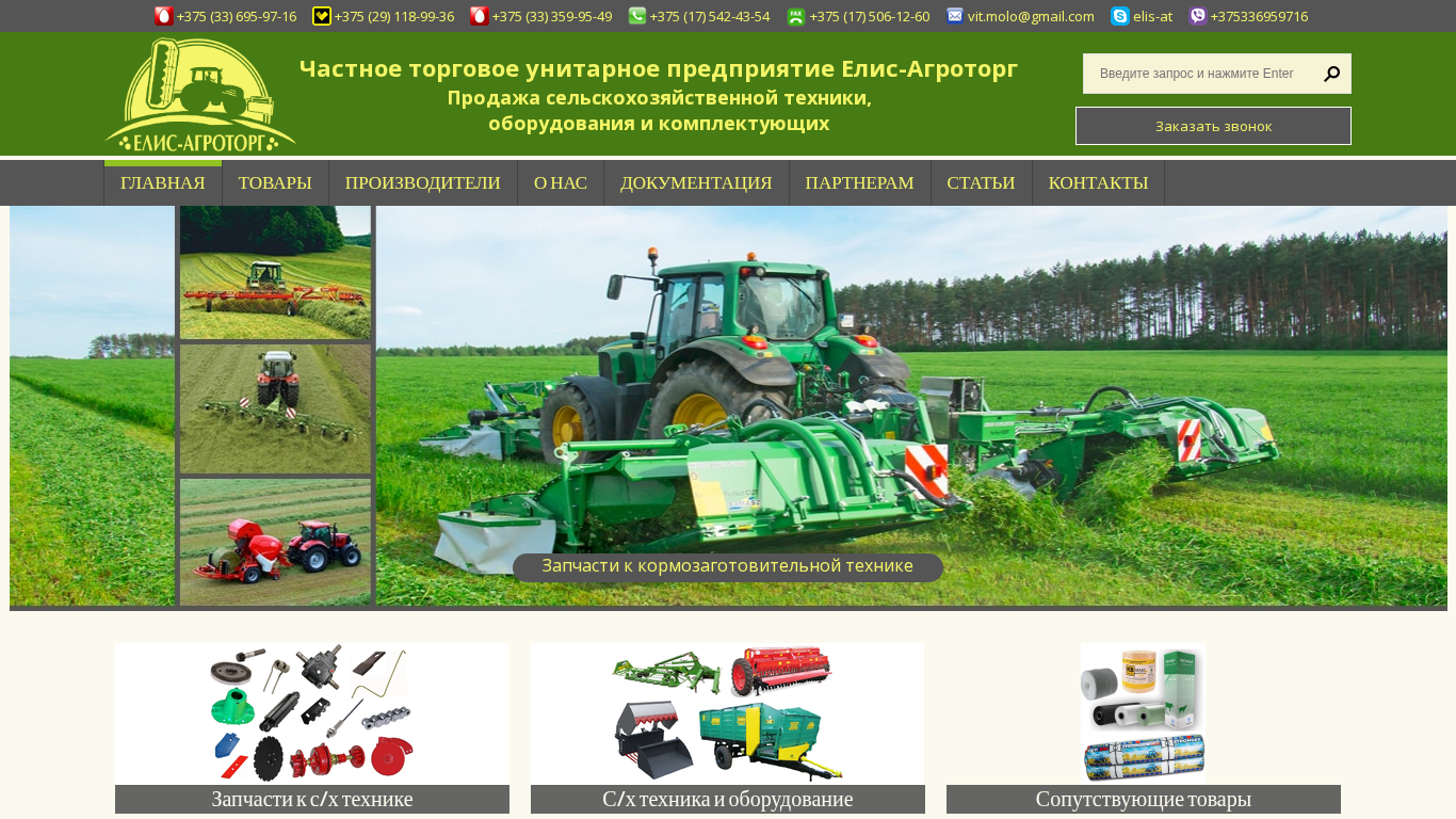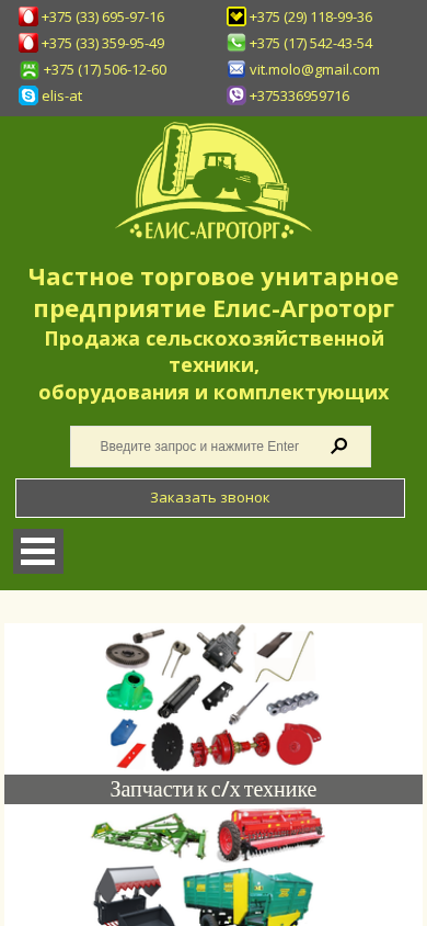 | AI-анализ | --- The website Elis-Agrortorg is dedicated to the sale of agricultural machinery, equipment, and spare parts. The keywords associated with the site include various farming machinery, brands such as Krone, Kverneland, Lemken, and parts for specific models like Krone Easy Cut and Kverneland VRP-8.3. The site offers components for various types of equipment, including cultivators, plows, seed drills, and press-collector combines. Brands featured include Krone, Kverneland, Lely Welger, and Lemken, among others. The site also includes contact information and a way to request a call. |
