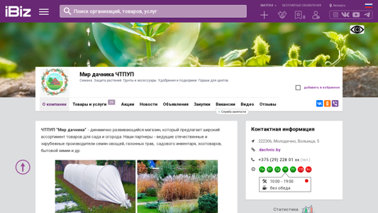 | Название / Заголовок | Мир дачника ЧТПУП - Семена. Защита растений. Грунты и аксессуары. Удобрения и подкормки. Горшки для цветов.. 222306, Молодечно, , Волынца, 5 |
