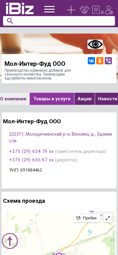 The website is for Mol-Inter-Fud OOO, a company producing agricultural supplements for rural farming. They manufacture adsorbents for mycotoxins. The website provides contact information and an address for the company, located in Molodechno, Minsk region, Vyazovets district, Zhilmilny settlement, Building S/J. The company's hours of operation are Monday through Friday, 9:00 AM to 6:00 PM, with no lunch break. The website includes sections for company information, products and services, news, and contact details. The website also features a map and instructions on how to reach the company. The main phone numbers for the company are +375 (29) 624 79 xx (assistant director) and +375 (29) 655 67 xx
