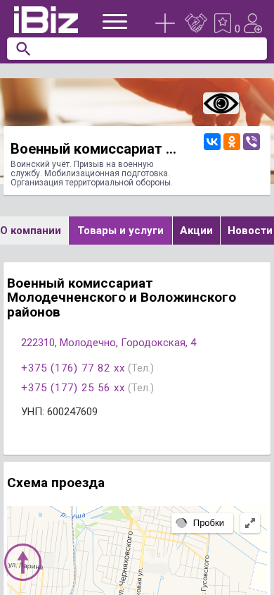 | Название / Заголовок | Военный комиссариат Молодечненского и Воложинского районов - Воинский учёт. Призыв на военную службу. Мобилизационная подготовка. Организация территориальной обороны.. 222310, Молодечно, , Городокская, 4 |
