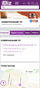 | AI-анализ | The website is for Kommunalnik UP, a company providing communal services to the population in Molodeчно, Belarus. The homepage includes a map, contact information, and a schedule of hours. Users can view company information, products and services, news, job listings, and videos. Communal services offered include utilities, municipal services, and purchases. The site also has a section for announcements and a contact form. The domain is registered under 'АЙБИЗ МЕДИА' and can be found in the business and organization category of ibiz.by. The company's contact details include phone and fax numbers, and the address is listed as Velikoselskaya, 38V-14, Molodeчно, 222310. The site is open from 8:00 to 17:00 on weekdays |