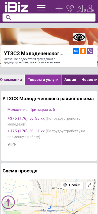 | Название / Заголовок | УТЗСЗ Молодеченского райисполкома - Оказание содействия гражданам в трудоустройстве, занятости населения.. 0, Молодечно, , Притыцкого, 5 |