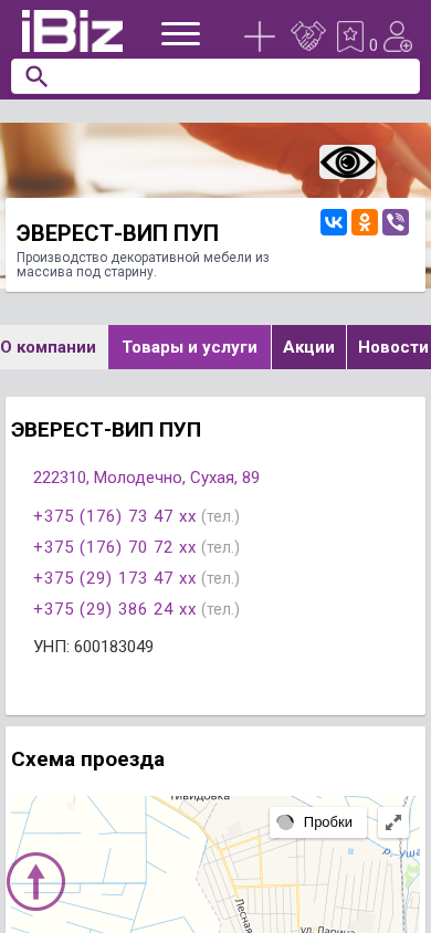 | AI-анализ | This website is for a Belarusian company named Everest-VIP PUP, which produces decorative furniture from reclaimed wood. The website includes a contact section with multiple phone numbers, an address in Molodechnio, Sukhaia 89, and a map for directions. The company offers various furniture and services, including new items and discounts. Everest-Vip Pup is listed under the furniture category in the Ibiz.by business directory. The website is operated by OOO "AIBIZ MEDIA". |