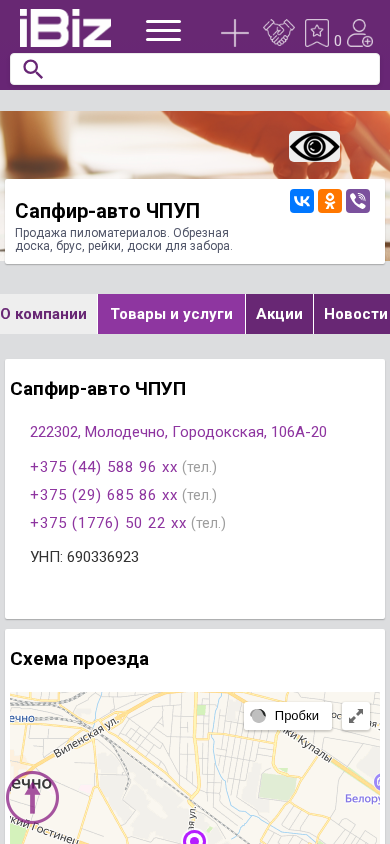 | Название / Заголовок | Сапфир-авто ЧПУП - Продажа пиломатериалов. Обрезная доска, брус, рейки, доски для забора.. 222302, Молодечно, , Городокская, 106А-20 |