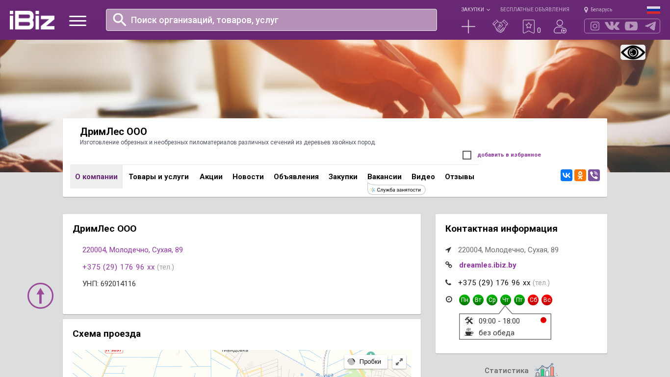 | AI-анализ | This website is for the Belarusian company DrimLes OOO, specializing in the production of various sections of pine, spruce, and fir timber in both rough and processed forms. The company's address is 220004, Molodechno, Sukhaia, 89. The website provides contact information including a phone number +375 (29) 176 96 xx and UNP number 692014116. The business hours are from Monday to Friday, 9:00 AM to 6:00 PM, without lunch breaks. The company's offerings include timber products and related services. |