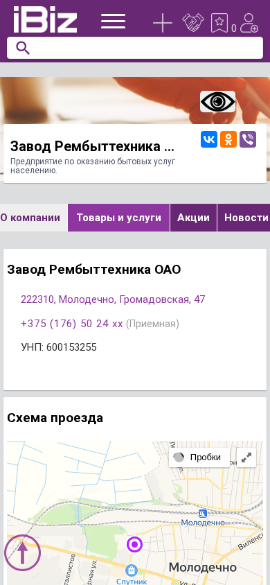 | Название / Заголовок | Завод Рембыттехника ОАО - Предприятие по оказанию бытовых услуг населению.. 222310, Молодечно, , Громадовская, 47 |