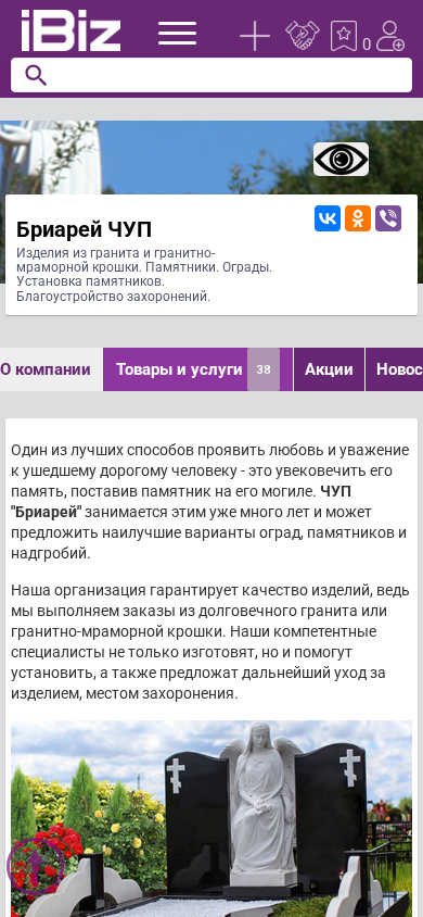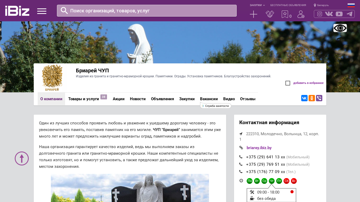| AI-анализ | --- This online resource belongs to Бриарей ЧУП, a company specializing in the production and installation of granite and granite-marble chip memorials, monuments, fences, and cemetery improvement services. The website provides information on the company's offerings and includes contact details and a map for easy access. Keywords associated with the site include 'services', 'products', 'Belarus', 'Minsk', 'Vitebsk', 'Grodno', 'Gomel', 'Mogilev', 'Brest', and 'Minsk region'. The top words on the site are 'services', 'products', 'Belarus', 'companies', and 'ritual'. The site offers a range of ready-made products as well as custom designs for memorials and cemetery improvements. The company guarantees quality, as all products are made from durable gran |